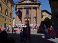 Auf der Rückfahrt machten wir noch Halt in Siena. Unser Hotel war gut gewählt, unmittelbar an einer Rolltreppe, die zur Altstadt raufführt. Wir liefen dann den Nachmittag durch die Stadt, begegneten überall den Trommlern und Fahnenschwingern der Stadtteilgemeinschaften und besichtigten Strassen, Paläste, den Dom und das Treiben auf der Piazza del Campo, wo die Leute einfach auf dem Platz sitzen, weil er so abschüssig ist wie anderswo die Treppen.