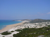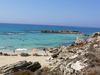 Am nächsten Tag gings dann ganz in den Osten zur Spitze der Karpaz-Halbinsel. Die Gegend dort ist leicht hügeliges Gestrüpp mit schroffen Klippen, die gelegentlich sandige Buchten bilden. Die grösseren dieser Buchten haben so eine Art Dünen im Hinterland. Bewohnt wird der Karpaz von wilden Eseln und Meeresschildkröten, die aber nur zum Eierlegen kommen (die Schildkröten, nicht die Esel). Schildkröten sahen wir an diesem Tag keine, aber jede Menge Esel. Ziemlich aufdringliche an der Strasse und am Parkplatz des Klosters Sankt Andreas, etwas scheuere Tiere auch neben der Strasse. Bademöglichkeiten gab es hier endlich auch, einige der Buchten wurden auch als Campingplatz, Picknick-Areal oder Strandbar genutzt.