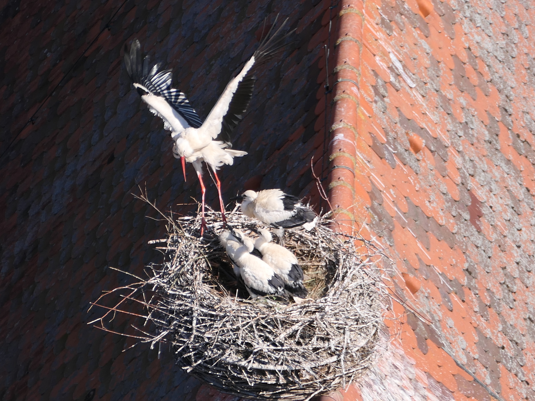 Wir hatten uns die Besteigung der Glockenturms Daniel noch aufgehoben. Wir waren zu früh dort und durften gleich beim Aufsperren mit dem Türmer die 350 Stufen nach oben mitgehen. Von dort hat man wieder eine tolle Ausssicht auf den Krater, die Stadt Nördlingen und man kann von oben in Storchennester reinschauen.